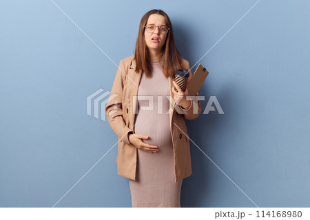 Sad pregnant woman in beautiful dress and jacket posing isolated over blue background holding documents and disposable cup of coffee feeling unwell during work