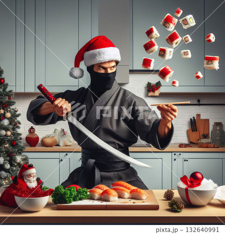 A ninja wearing a red Santa Claus hat with a katana in his hands is preparing sushi in the kitchen. Levitation of sushi. Christmas interior, close-up