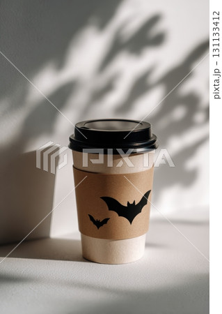 Halloween Coffee Cup Mockup with Bat Shadows on White Surface