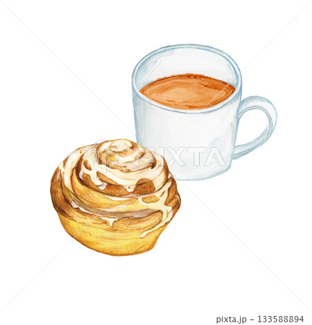 手描き水彩のコーヒーとシナモンロールのイラスト