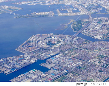 千葉県浦安市行徳橋の沖、東京湾上空から東京港周辺の葛西、新木場、辰巳、豊洲、有明方面を見る