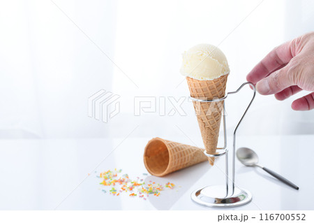 Tasty summer treat - vanilla ice cream cone with creamy texture and crispy edge, minimalist layout for product or banner use.