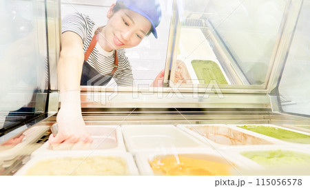 アイスクリームをスクープするジェラート店の女性スタッフ