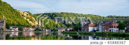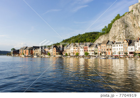 西ヨーロッパのベルギー ワロン地域ナミュール州の都市ディナン 町の中心を流れるムーズ川沿い早朝の景色