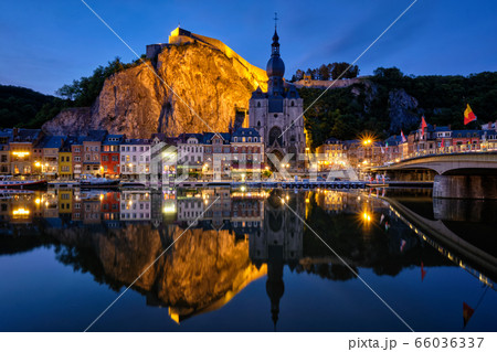 西ヨーロッパのベルギー ワロン地域ナミュール州の都市ディナン 町の中心を流れるムーズ川沿いの夜景