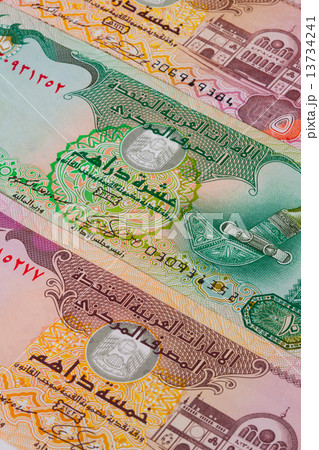 United Arab Emirates dirham currency money bills. The current banknotes lies on table in big amount