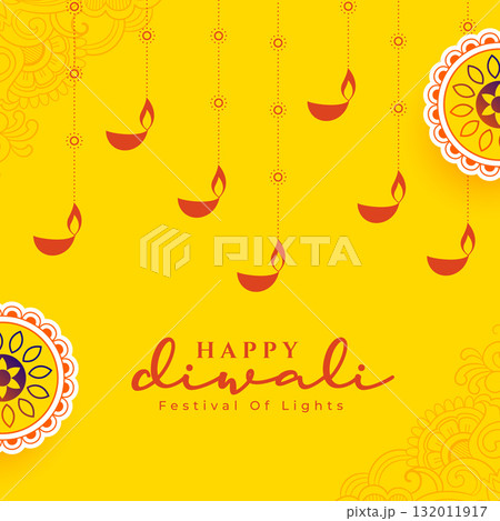 happy diwali yellow background with hanging lamps