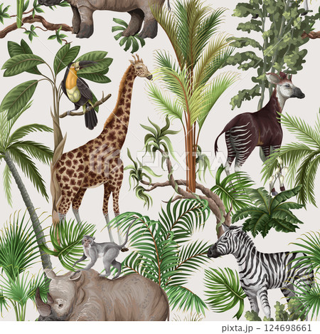 Seamless pattern with jungle animals and trees. Palm trees, giraffe, okapi, zebra etc. Vector.