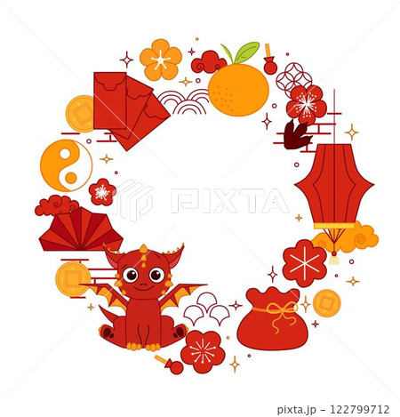Chinese New year of red Dragon 2036 vector graphic line round circle frame. style banner frame scroll board decoration. Chinese lunar new year, lantern festival mascot