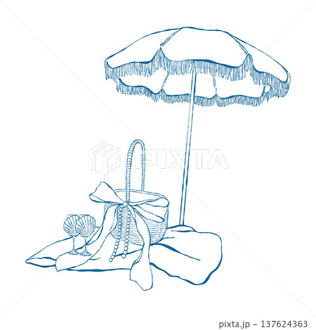 Beach umbrella, basket, and glasses with drinks. Vintage illustration for a beach party or coastal wedding. Vector outline clip art in blue
