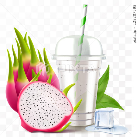 Clear plastic cup with dragon fruit juice or pitaya smoothie. Cup with sphere dome cap for milkshake, lemonade. Fruity organic shake with ice cube. Fruit cocktail. Realistic 3d vector template