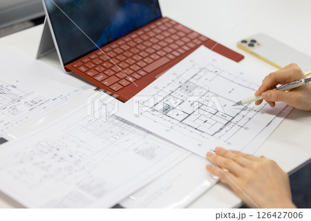 建築図面を確認する設計士の手元作業