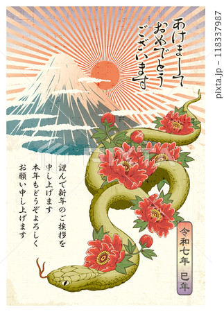 2025年賀状テンプレート「花へびと富士」あけおめ 添え書き付パターン