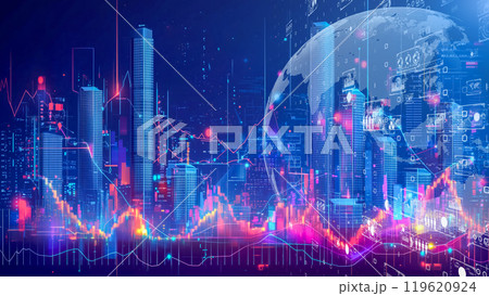 都市とネットワーク 近代的なビル群空撮と通信イメージ IoT ICT