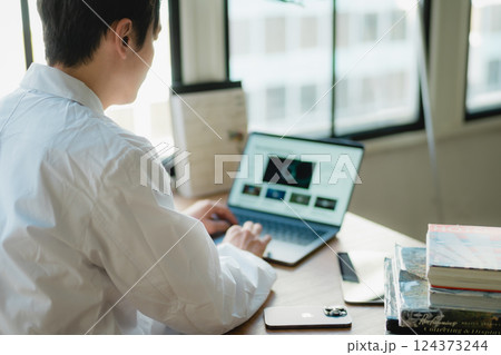 カフェでテレワーク・ノマドワークする若いアジア人女性