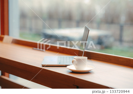 コワーキングスペースのデスクに置かれたノートパソコンとコーヒー