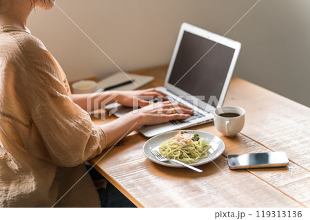 家,別荘,コテージでパソコンを使う女性(リモートワーク,在宅ワーク,副業)