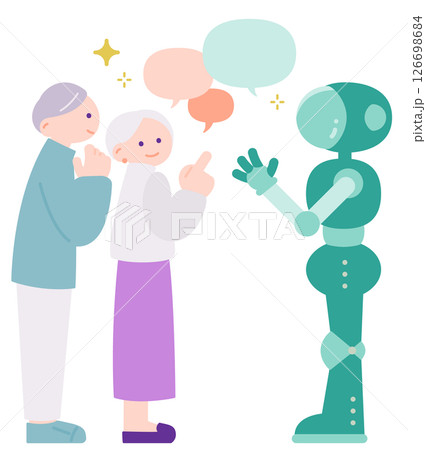 AIロボットに相談する高齢夫婦の横顔イラスト 未来的コミュニケーション