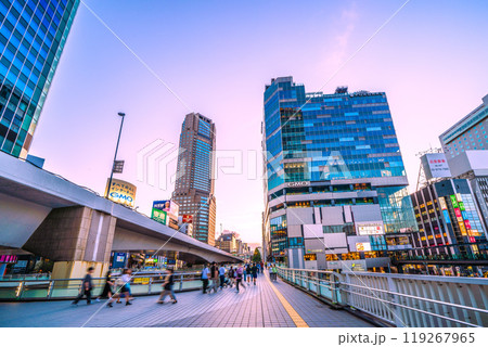 日本の東京都市景観 歩行者デッキから渋谷駅などを望む