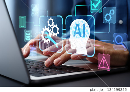 AI駆動の自動化されたメンテナンスとシステム更新。問題の発見と修正の自動化。エンジニアがノートパソコ