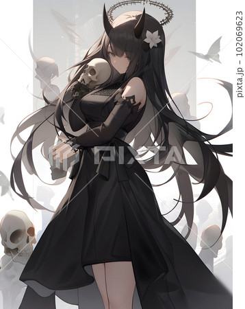 ドクロを手に持つ黒いドレスに身を包んだ女性「AI生成画像」