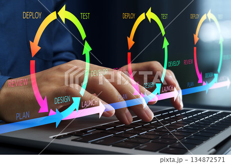 アジャイル開発プロセス。継続的フィードバック手法。ノートパソコンを使ってソフトウェアを迅速かつ柔軟に