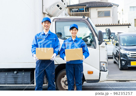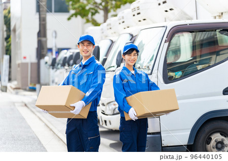 笑顔で荷物を持つ男女配達員 セールスドライバー 運送業者