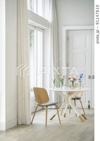 花瓶の置かれた白いテーブル 窓辺 花のある暮らし イメージ