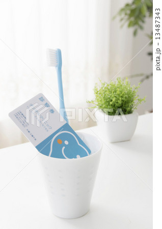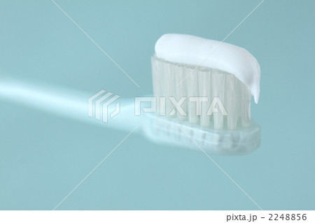 笑顔で歯ブラシと歯磨き粉を持つ女性のイメージ (写真素材)