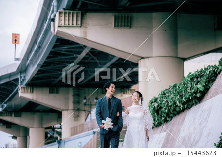 ピクニックをしながら前撮り撮影をする新郎新婦