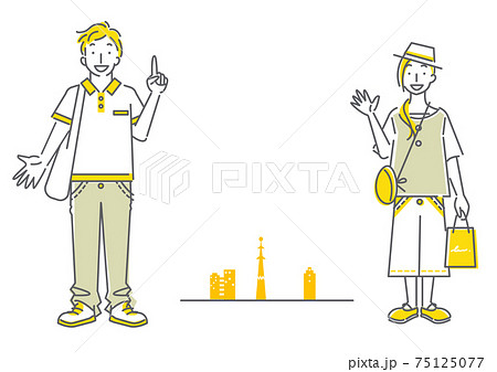 楽しくお出かけする若いカップルのシンプルでさわやかな線画イラスト