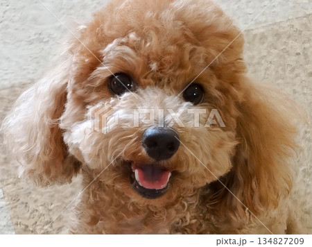 ペットカメラがある部屋のソファに座るトイプードル(5歳の男の子)
