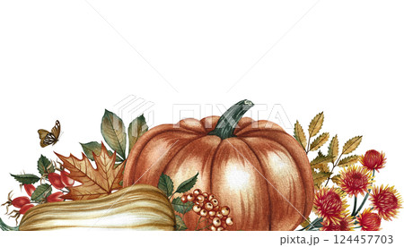 Border frame with pumpkins, flowers and leaves. Handmade watercolor illustration. Color image of the autumn harvest. For greeting and invitation cards, posters, stickers, prints and banners.