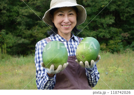 冬瓜を収穫する中年女性