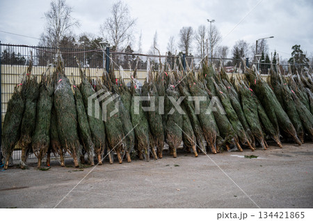 Row of wrapped Christmas trees for sale at outdoor holiday market
