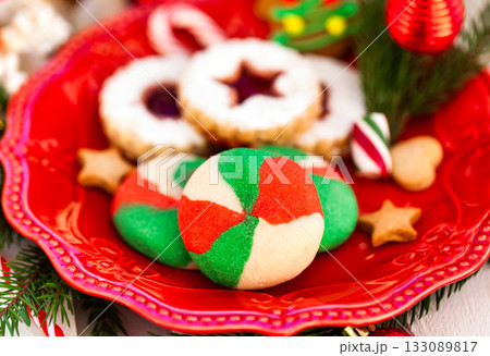 Sweet Shortbread Tricolor cookies and Linzer cookies, Christmas decoration around