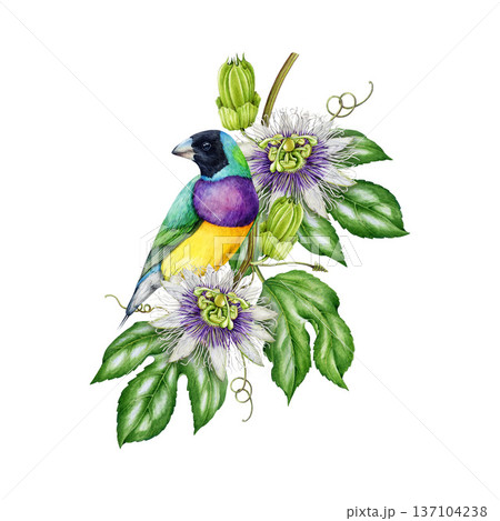 Bright tropical bird with exotic flowers watercolor illustration. Hand drawn Australian gouldian finch perched on lush passionflower vine vintage style realistic illustration on white background