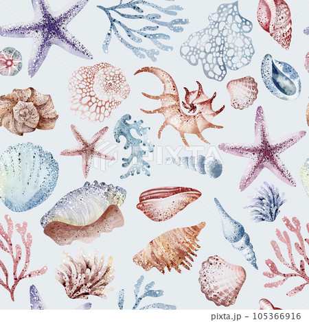 Marine seamless pattern marine animals, corals, plants, seashell, starfish, octopus, seahorse, algae, turtle. Watercolor marine background.