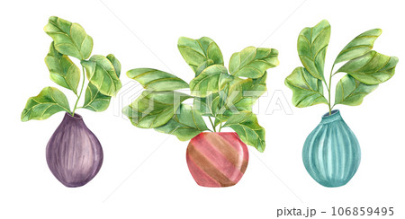 Set of watercolor ceramic vases, pots and green plants. Ficus lyrata, ceramics, home comfort, decor, houseplants with fiddle-leaf fig, interior decor, design element. Watercolor illustration