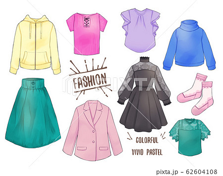 レディースの春夏ワードローブの手描きイラスト詰め合わせ_アパレル&小物_ペールカラー