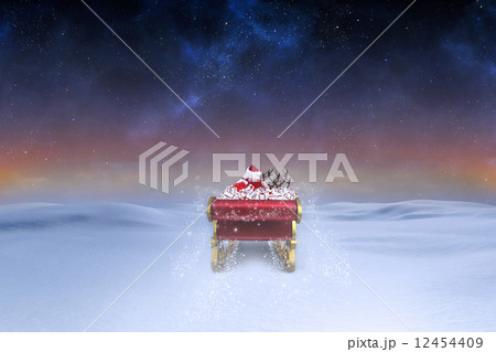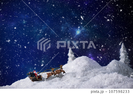 Christmas greeting card with Santa Claus ride on reindeer. Creative Christmas composition. Christmas background.