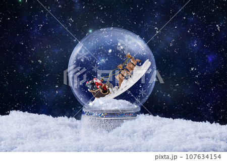 Christmas snow globe with Santa Claus ride on reindeer inside. Christmas greeting card with magic snow globe decoration with snow falling. Christmas background.