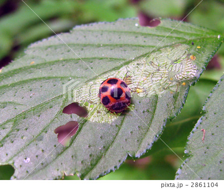 生き物 昆虫 トホシテントウ、メスは網目状の食痕を残して食事に夢中ですが・・・