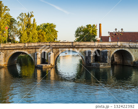 Old bridge, Ponte Vhela, reflected over Nabao river, historic centre of Tomar, Portugal