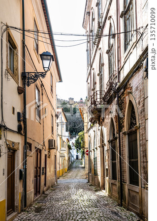 Narrow street with old buildings in the old town Tomar in Portugal.