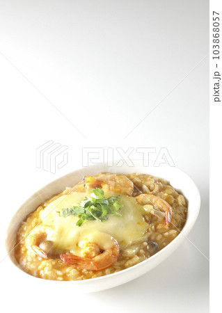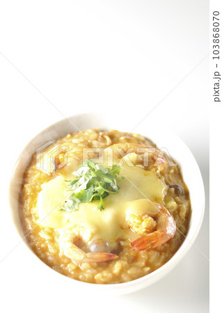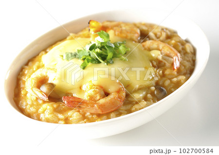 海老、チーズ、パクチー、熱々トムヤムリゾットを白背景で撮影