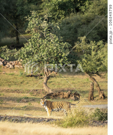 wild female bengal tiger or panthera tigris with tail up in natural green habitat in early winter season safari at ranthambore national park forest reserve sawai madhopur rajasthan india