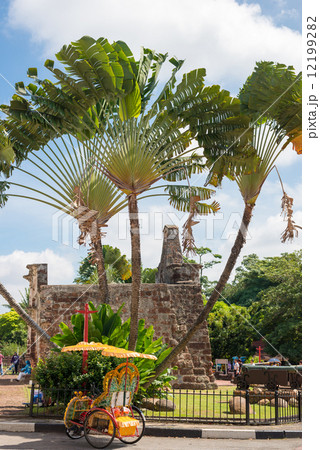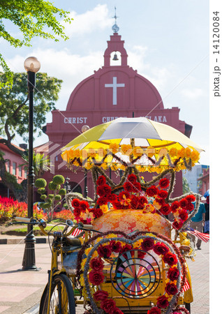 マレーシア マラッカのオランダ広場の教会とトライショー