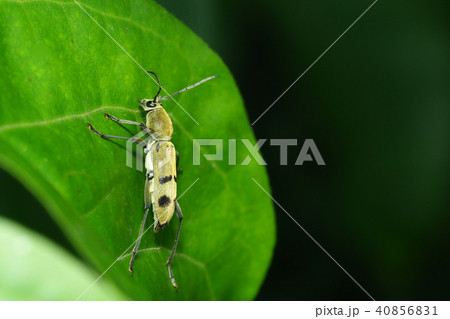 生き物 昆虫 フタオビミドリトラカミキリ、ウグイス色かくすんだ萌黄色?微妙な色合いが美しい