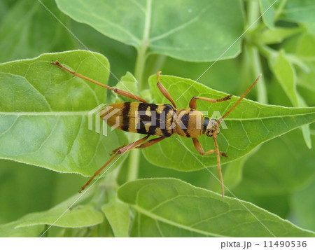 生き物 昆虫 ヨツスジトラカミキリ、黄色と黒の縞模様はアシナガバチにそっくり。ベイツ型擬態のひとつ